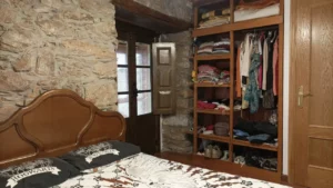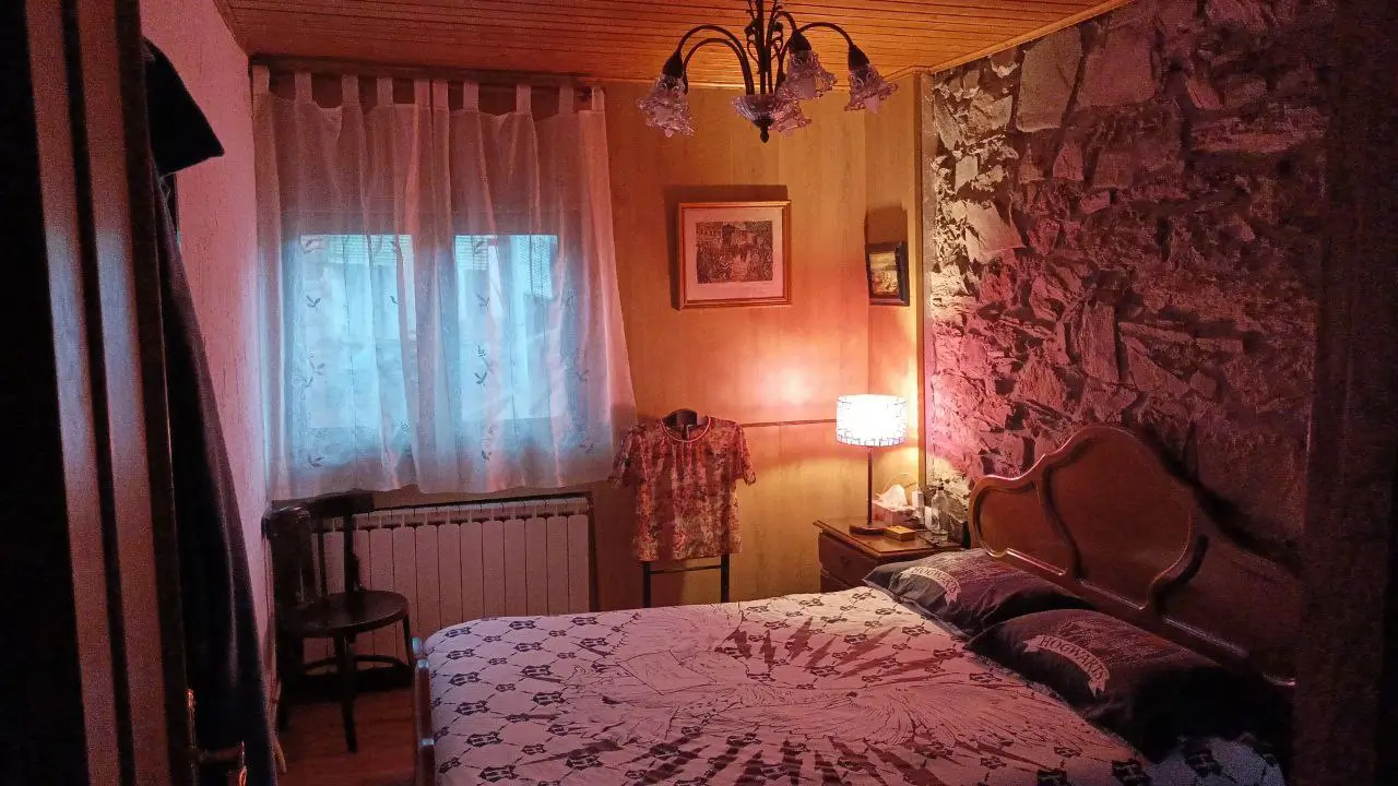 Aquí la novedad es la pared de piedra que estaba ‘en basto’, necesitaba tratamiento para no perder arenilla, limpiar restos de yeso y, aprovechando la obra, trasladar enchufe y conmutador eléctrico a una posición más cómoda. Para ello he reciclado un trozo de tronco empotrado en la piedra que hace de caja.